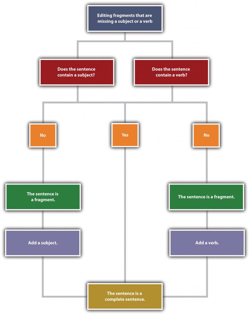 Figure 5.4 Editing Fragments That Are Missing a Subject or a Verb. Alternative text long description: The flowchart guides writers in determining whether a sentence is complete or a fragment. At the top, the chart begins with the main box: “Editing fragments that are missing a subject or a verb.” The chart then branches into two paths: Left path: “Does the sentence contain a subject?” Right path: “Does the sentence contain a verb?” Left Path (Subject Check): If the answer is No, the chart states: “The sentence is a fragment. Add a subject.” If the answer is Yes, the chart continues downward to the final conclusion box. Right Path (Verb Check): If the answer is No, the chart states: “The sentence is a fragment. Add a verb.” If the answer is Yes, the chart also continues downward to the final conclusion box. Final Box (Bottom Center): Both the “Yes” answers from the subject and verb paths lead to the same conclusion: “The sentence is a complete sentence.” Overall, the chart shows that a sentence must contain both a subject and a verb to be considered complete. If either is missing, the sentence is a fragment, and the missing part must be added.