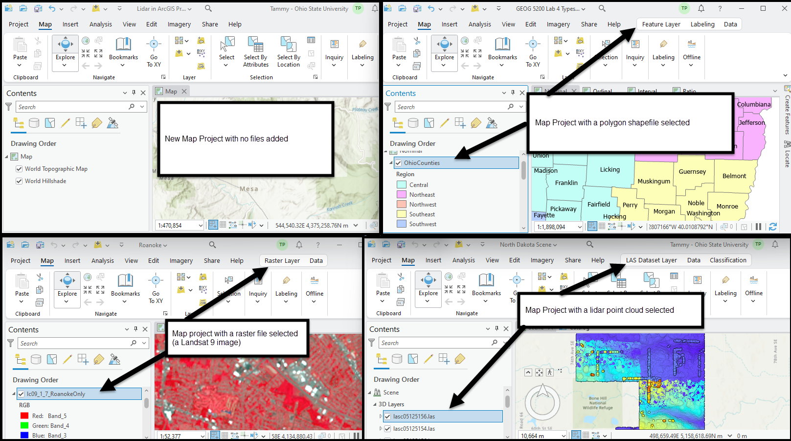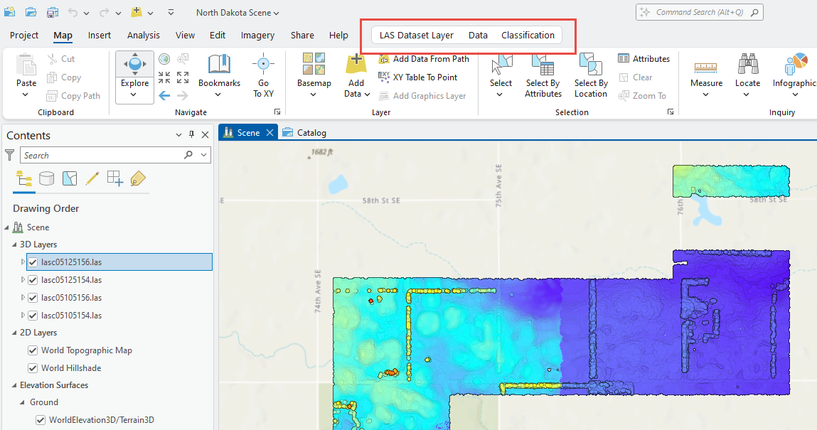 Various geoprocessing tools are available in any GIS to support vector, raster, or lidar point cloud data operations. With ArcGIS Pro®, many of these tools are context-sensitive—they activate when a vector, raster, or lidar point cloud has been selected in Contents. The tools associated with the selected data type appear on the title bar, accompanied by one or more tabs of its own, grouped within the new toolbar.