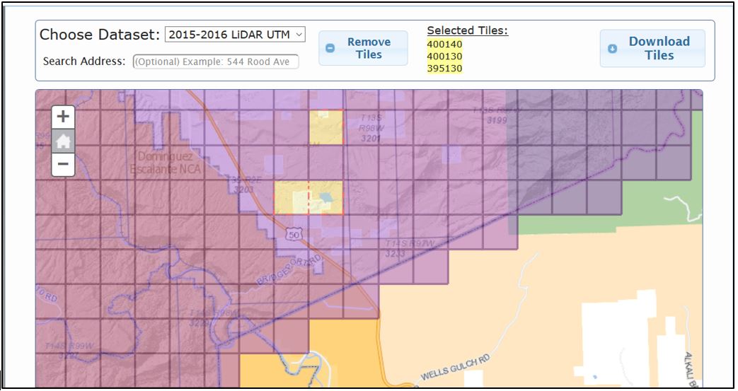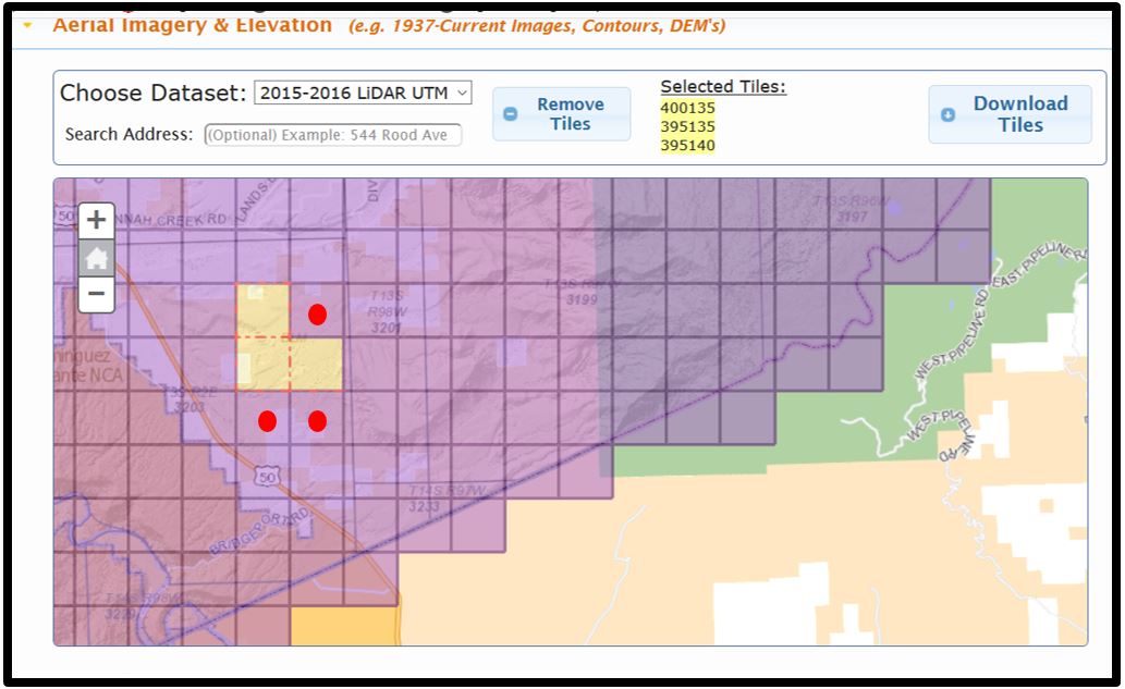 Go back to the Mesa County Colorado GIS website (https://emap.mesacounty.us/DownloadData/) to obtain additional lidar tiles. If you don’t recall how to navigate the site, review Chapter 7. Locating Lidar Data. Recall the location of the original three tiles selected in Chapter 7 and choose three additional adjacent tiles (indicated by the red dots in Figure 14.3).