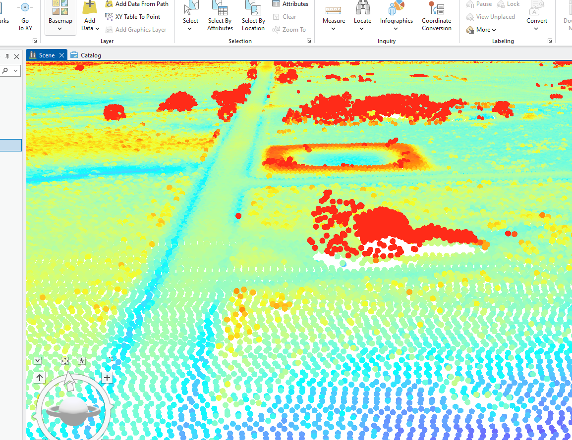 Why go through this example and review? Remember, the discussion started with using elevation as the symbology, but when using lidar data, you need to remember that the elevation values do not necessarily reflect the elevation of the ground. Lidar data provide the height of all measured data points, which could include treetops, the tops of buildings, the tops of cars, etc.