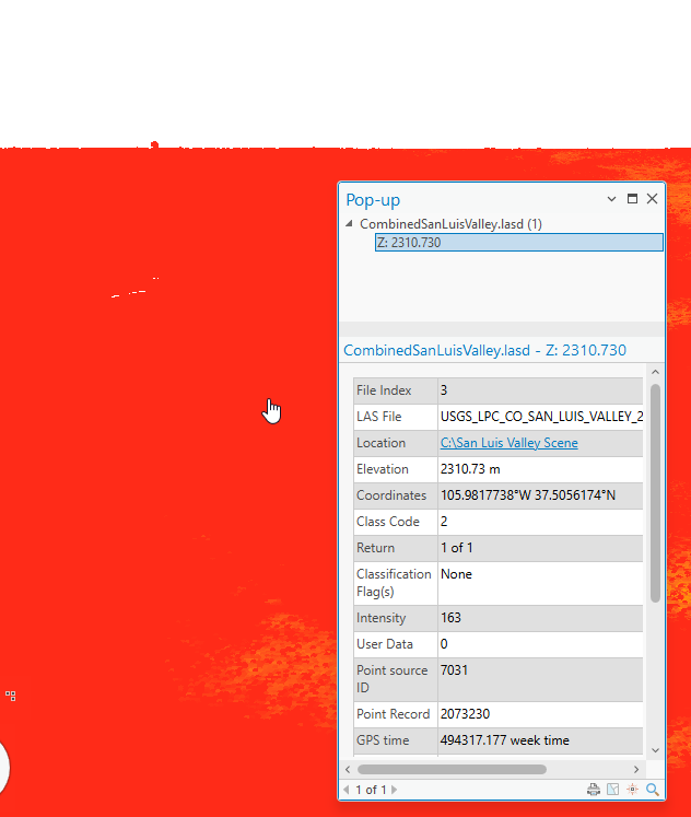 Now zoom back out and pick a point on the far west side of the point cloud. Can you zoom to the point identified in Figure 16.12? It is a bare earth elevation point (coordinates are found in the Pop-up dialog, then use Go To under the Map tab). The elevation for this point (a ground-based point) is 2,310.73 meters.