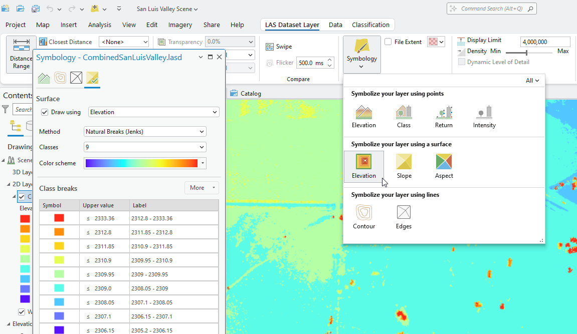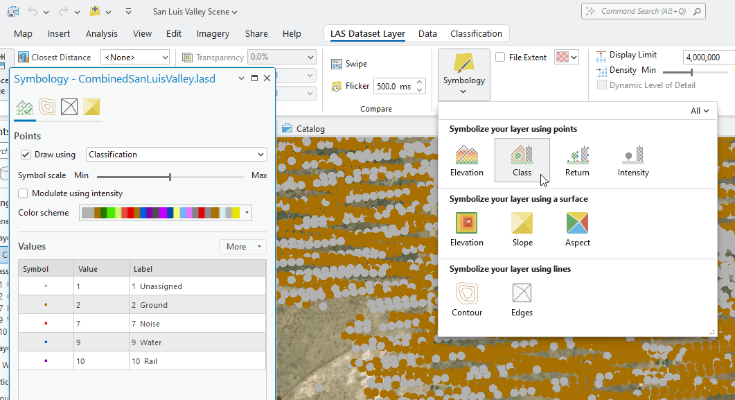 Chapter 15. Lidar Display Settings demonstrated how to change settings to display a portion of the point cloud. This chapter illustrates symbology, including symbolization types and types of points, using the San Luis Valley data in a map scene. Lidar symbology in a map template is handled similarly but without 3D capabilities.