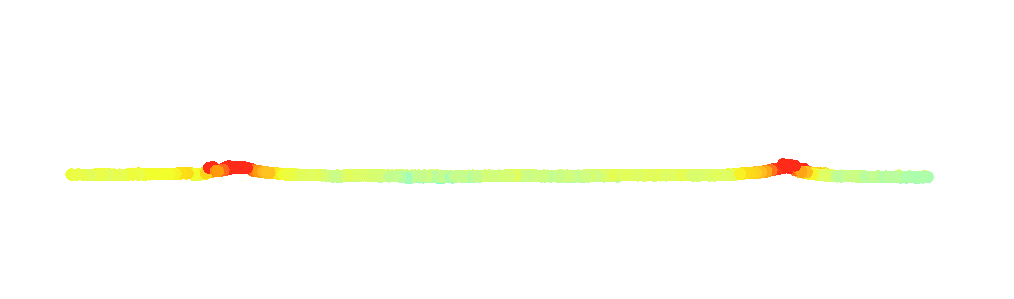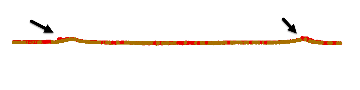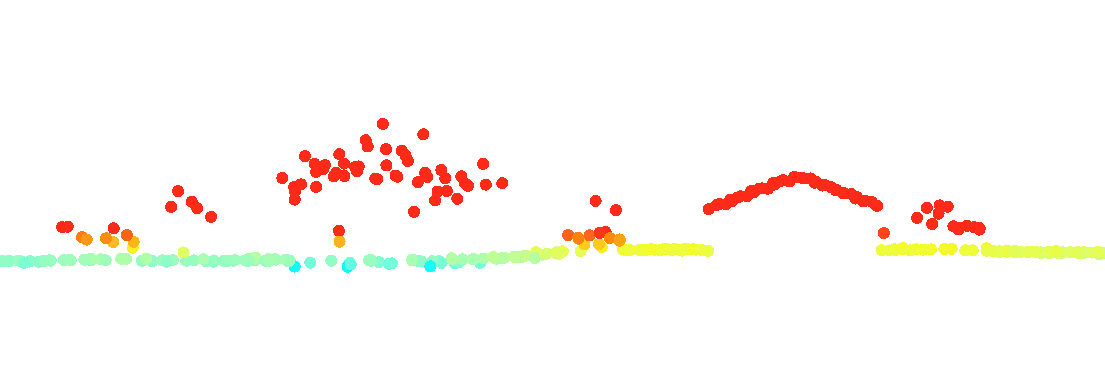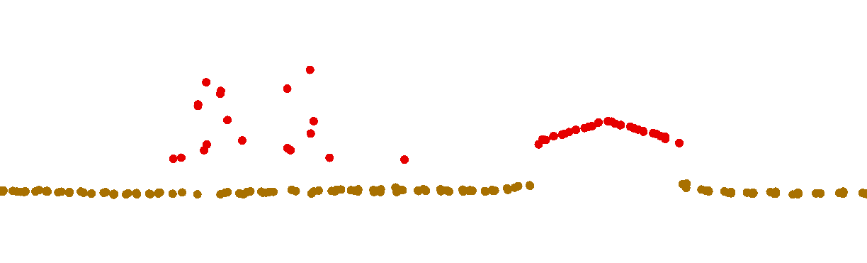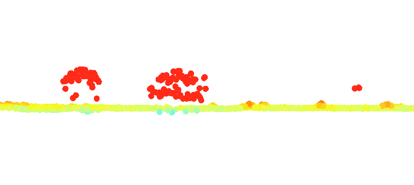 Use the mouse wheel to zoom in and out. Zoom in to the area between the cluster of red points on the left and red points on the right (Figure 17.8). From the symbology, red points are unassigned points. What feature is represented by the row with the peak? What about the cluster of unassigned points on the left? Notice some unassigned points are also intermingled with ground points (brown).