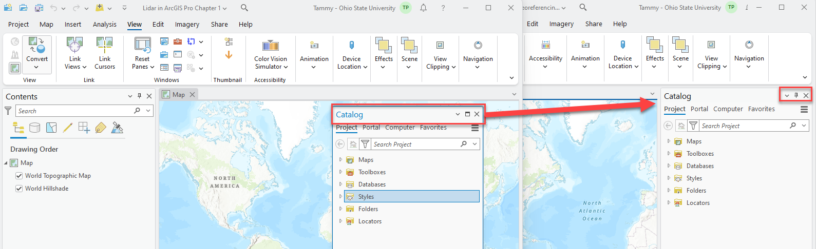 Close the Catalog Pane by clicking the X in the upper right corner of the Catalog pane (red box in Figure 2.3).