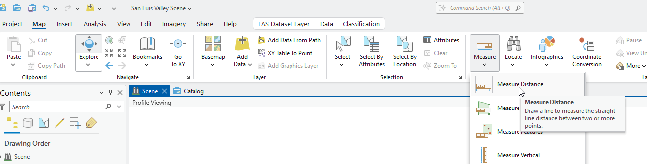 To measure the distances from ground to the various locations in the profile, you can go to the Map tab and click on the Measure tool and Measure Distance between points, but this tool is extremely difficult to use in profile view. (Figure 21.11).