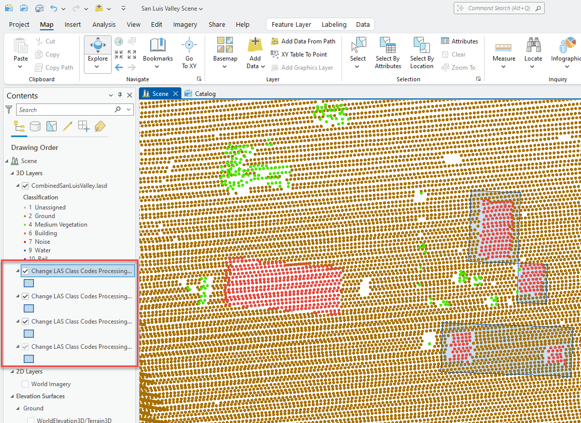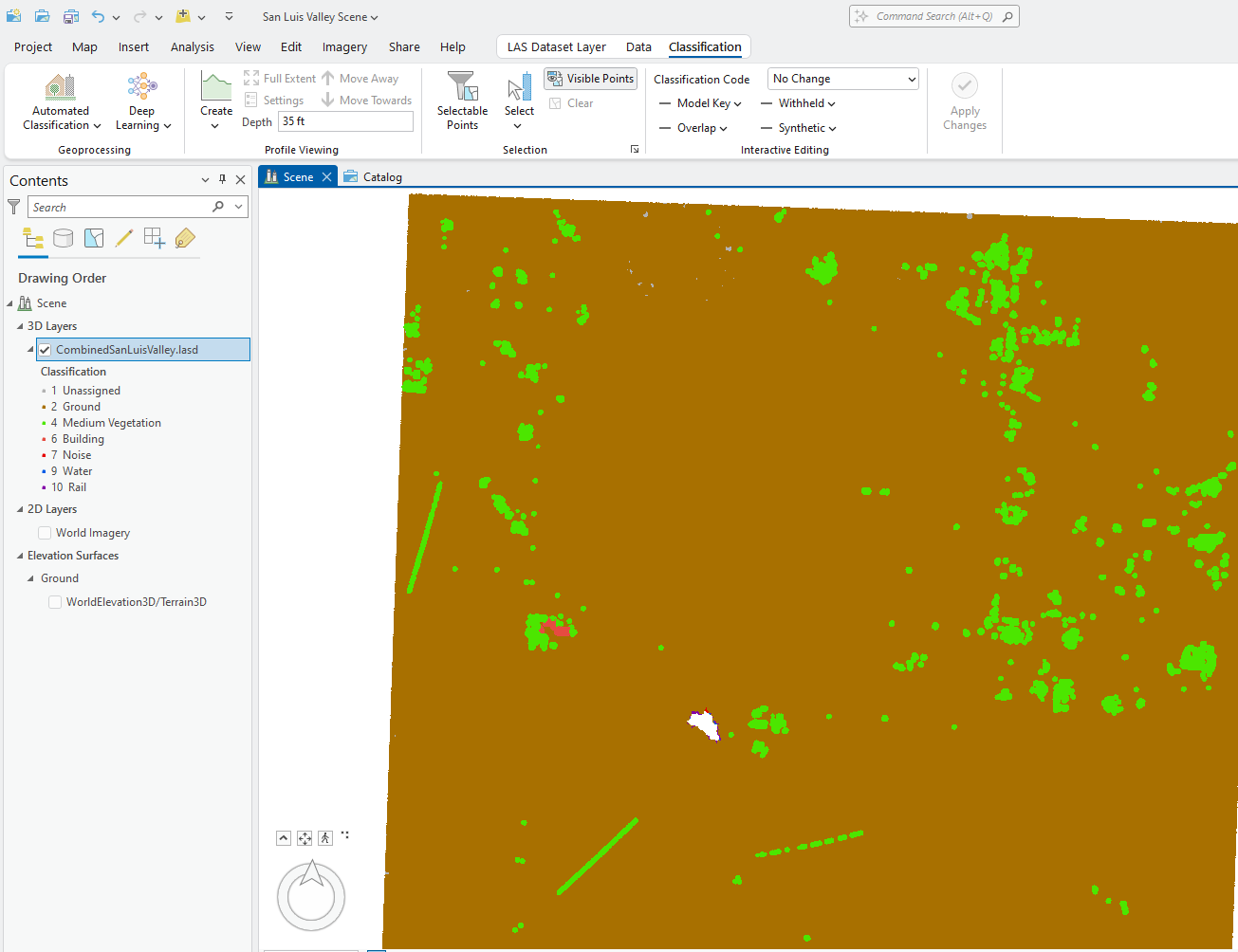 Figure 21.41 displays the result. Some points still remain low vegetation, and it appears some ground points were reclassified. It may be necessary to turn off the line feature class in Contents to better view the results.