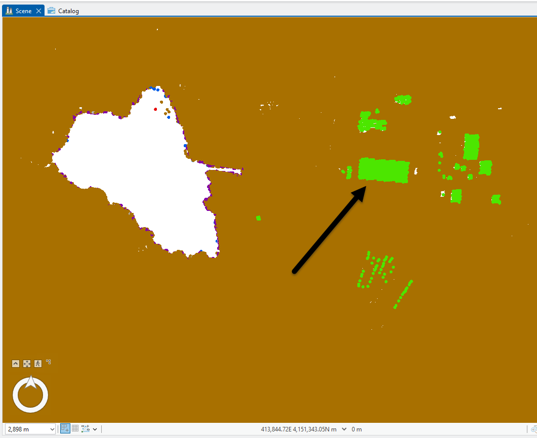 Zoom in to the area just to the east of the lake (Figure 21.19). In some instances, vegetation values, both low and medium vegetation, have been assigned to buildings or other features. Please note only the unassigned points were assigned values by the Classify by Height tool. In Chapter 19. Interactive Classification, with interactive processing, only a few buildings points were classified. Now, let’s see how to correct a misclassification.