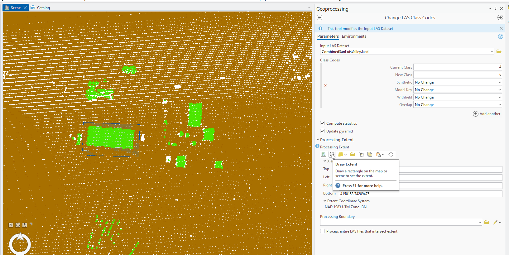 Select Reassign Classification to open the Change LAS Class Codes tool. Enter the values shown in Figure 21.20. Current Class is 4 (medium vegetation) and New Class is 6 (building). Expand Processing Extent and click on the Draw Extent tool and use this tool to draw a polygon around one of the buildings. Double click to end the drawing (Figure 21.20). Then Run the tool.