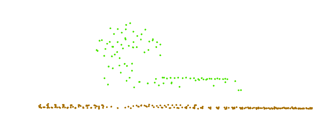 The trees, lidar points within 3 meters of the feature points, are now coded as high vegetation (Figure 21.31). The points are not symmetrical around the feature points because this is a 3D scene, and points are not necessarily an equal distance from each other.