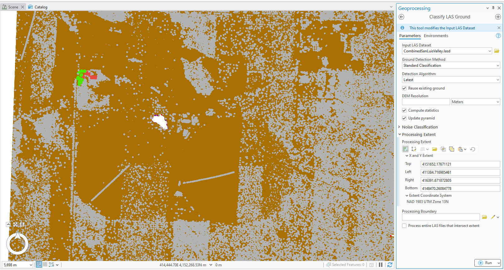 If comfortable with this tool and the settings, go ahead and process the entire dataset for ground points. Leave all settings as default with the exception of checking the box for Reuse Existing Ground. Please note that since the extent includes a larger region, the tool takes longer to run.