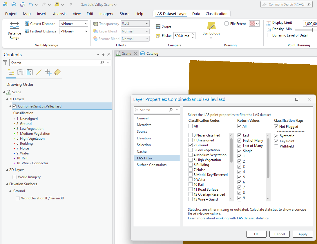 Open a new map scene and add the San Luis Valley dataset. Be sure to display ground points only (Figure 22.1), all classifications created in the last few chapters have been retained.