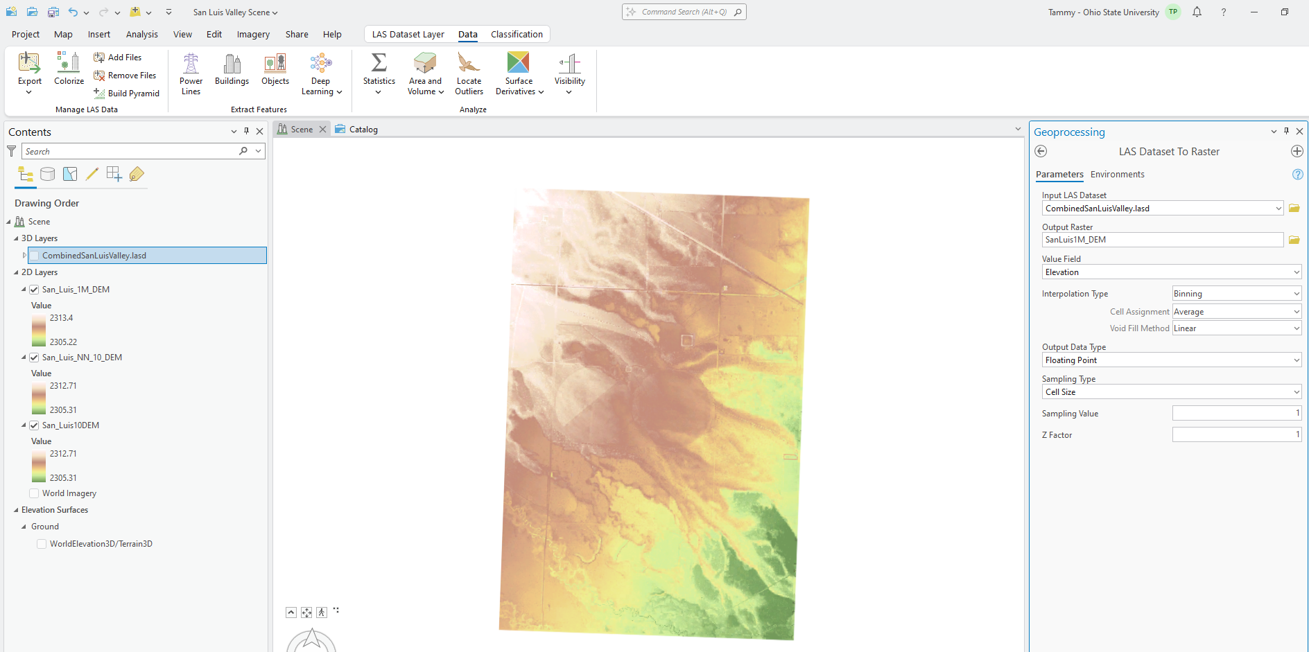 Open the LAS Dataset to Raster tool, leave all settings default except for Sampling Value, set it to 1 . Be sure to name Output Raster appropriately (Figure 22.17).