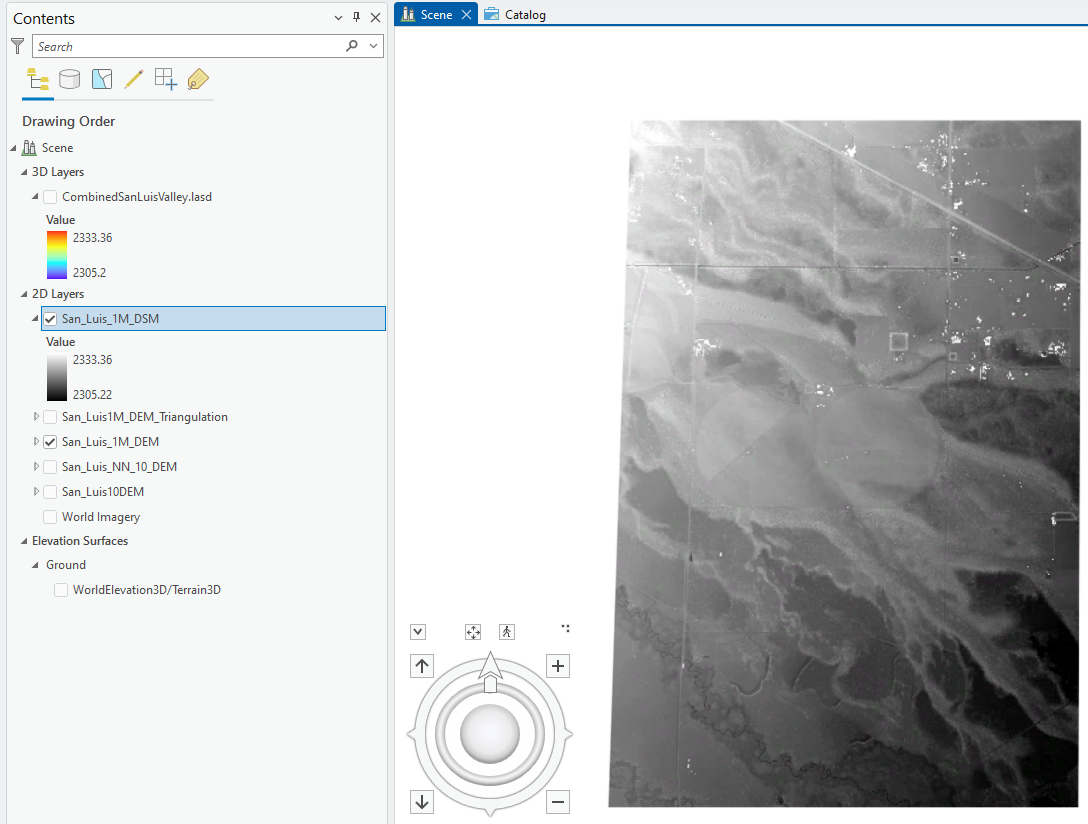 When finished, the DEM is automatically added to contents and the map viewer and displays in stretched symbology under the lidar point cloud. Turn the LAS dataset off and change the elevation symbology to Elevation #4 (Figure 22.8).
