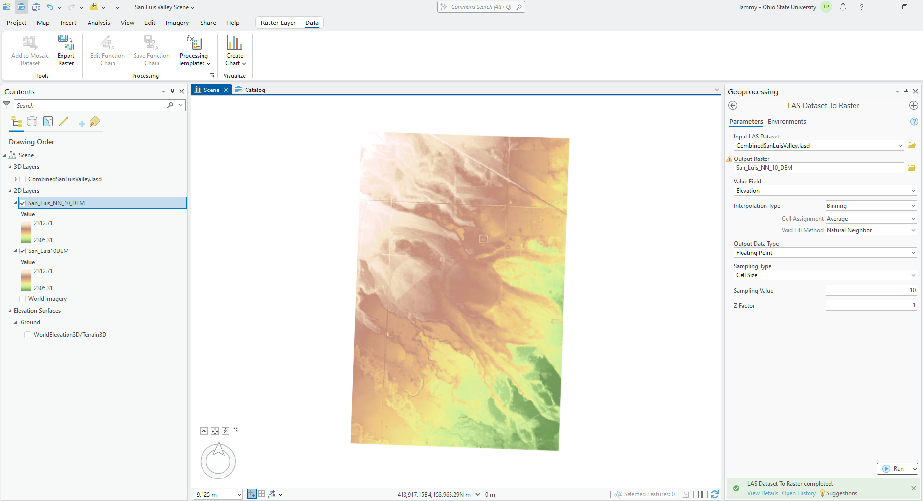 There is very little difference between the two DEMS from just changing this one setting—Linear versus Natural Neighbor. Constructing a DEM with a 10-meter resolution from a lidar point cloud with less than a 1-meter point density does provide a difference in the resulting DEMs.