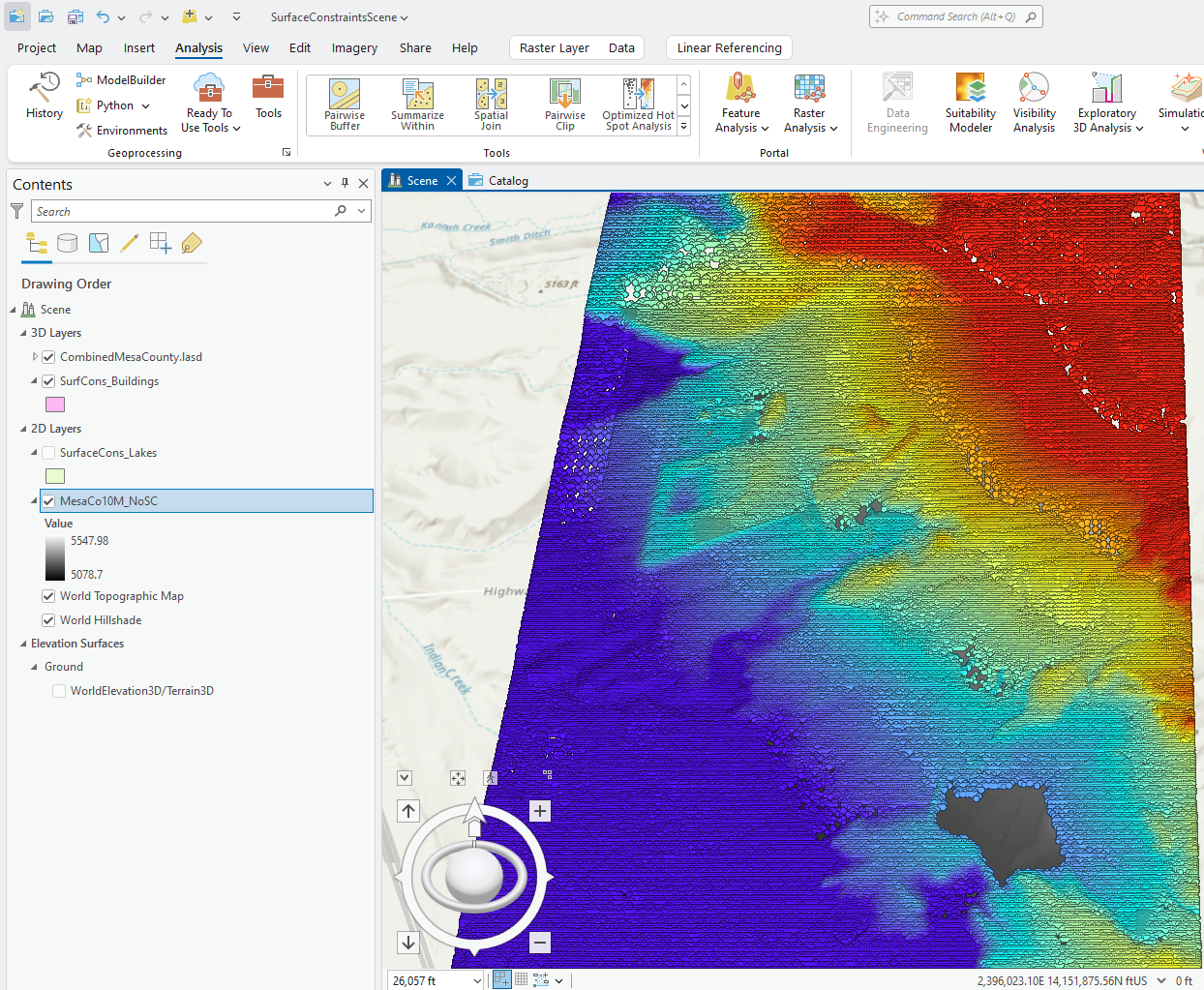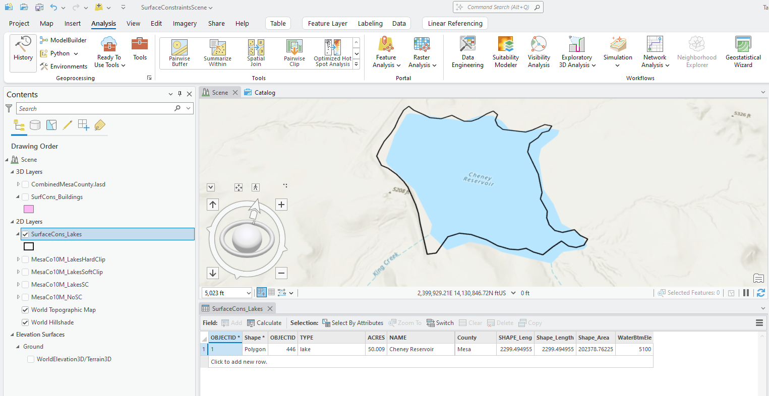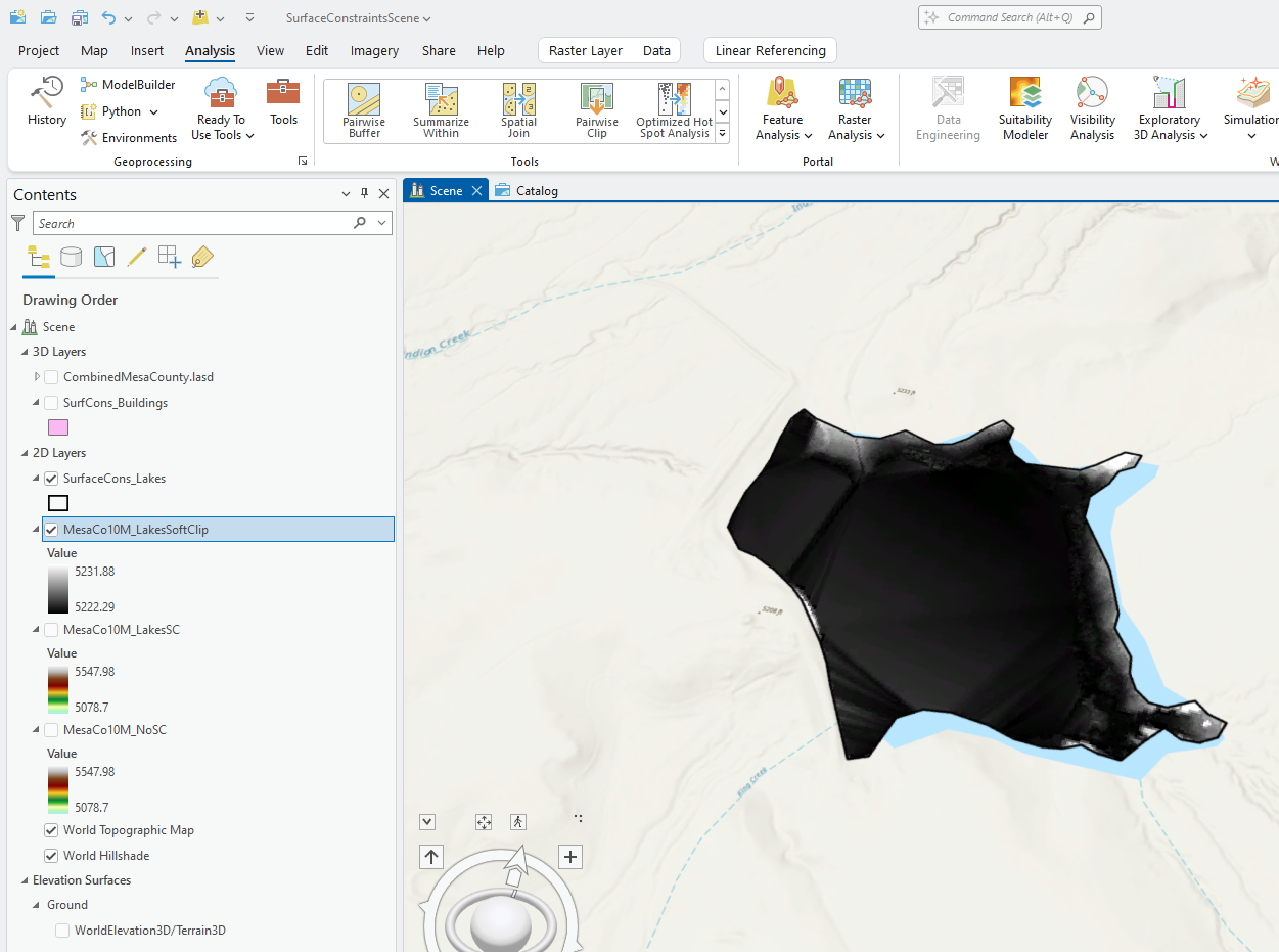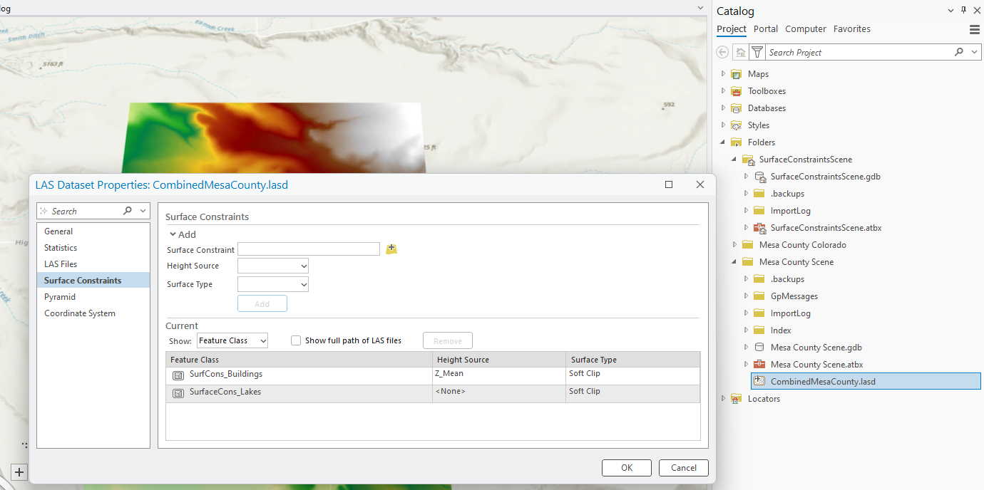 Create a new local scene project and add the Combined Mesa County .lasd file that has all six tiles. Add the lakes surface constraints feature class created in Chapter 23. Creating Surface Constraints. The building feature class can also be added for reference purposes only.