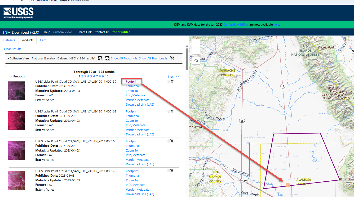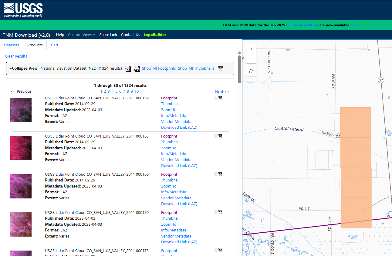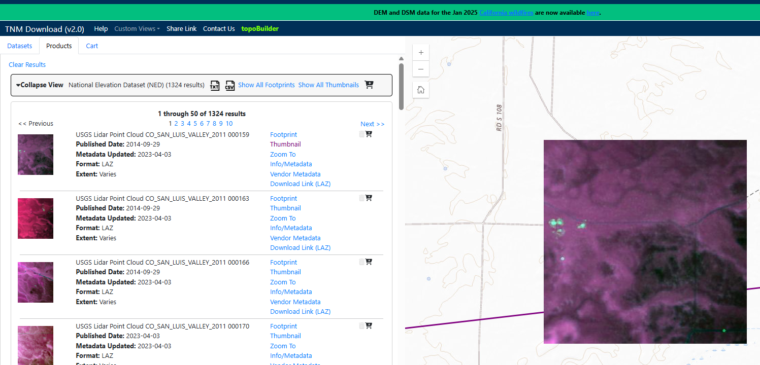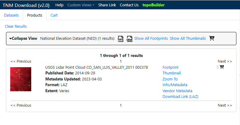 Next, click on Download Link (LAZ) for this file.  Once the download has completed, search for and download the other five files listed in Figure 8.23 using the 6-digit identifier (remember to stay zoomed in to San Luis Valley Colorado).   As noted above, we will process these LAZ files to LAS in Chapter 12.