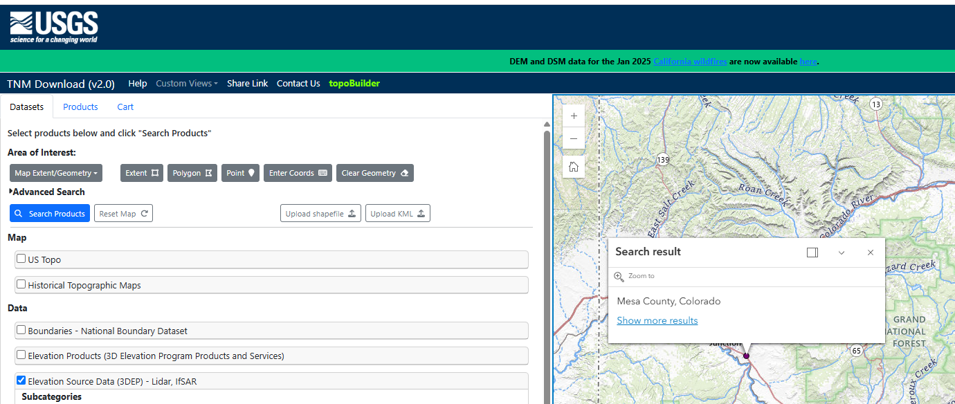 When checked, the information under the 3DEP product expands. DEM, ifSAR, and Lidar Point Cloud data are available. Check the Lidar Point Cloud(LPC) checkbox (Figure 8.4).